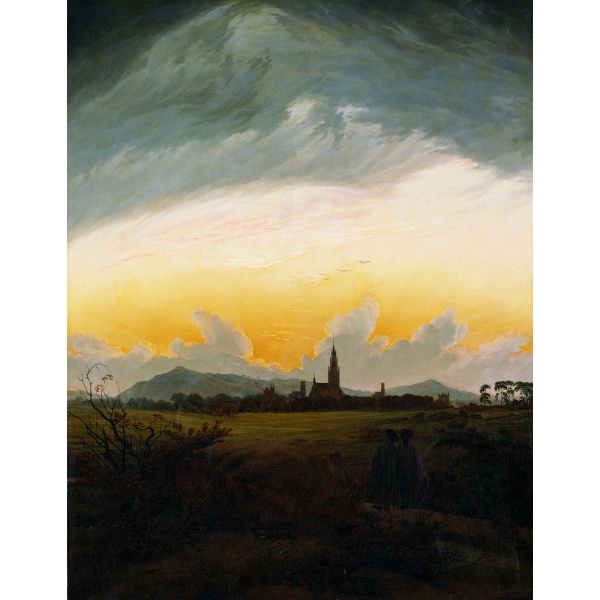 Answers can be found if one perceives the image as the symbolic representation of a religious statement. The clouds, opening like a curtain on the central plane of the picture, allow the light of the dawning day to pass, banishing the night and the darkness to the upper section. Against this outlandishly sized 'glimmer of hope', the city appears as a place of longing and the promise of a better life beyond the grave. The figures of two wanderers, facing reverently into the image, direct the gaze into its centre. They are emerging from the shadowy 'valley of death' and its burial mound to now face the light of 'celestial Jerusalem'.