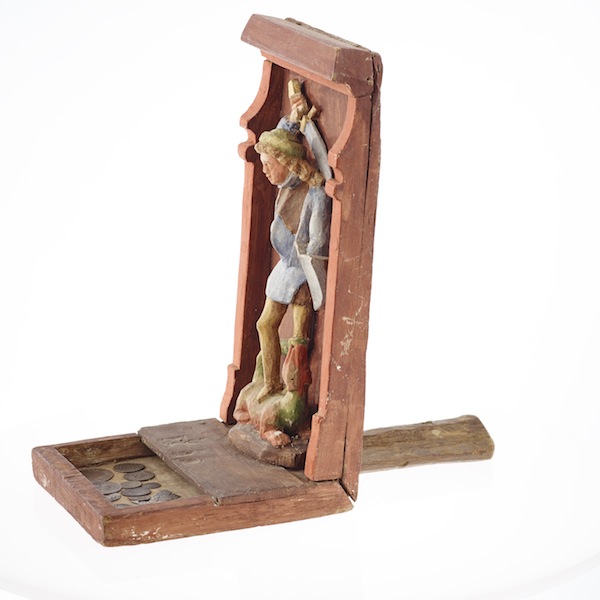 A 'Bedelbrett', a collection board whose name shares etymological roots with the word 'betteln' (to beg), is used to gather the voluntary donations after church services. The carved relief depicts St George. Water paints were added in 1939.