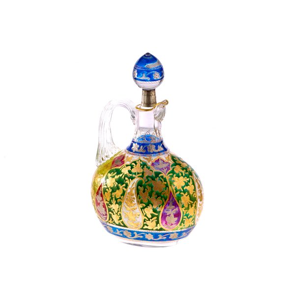 Artistically designed with enamel paints, the cut glass decanter is a product of the Silesian glass factories owned by Fritz Heckert in Petersdorf. The ornamental style is called jodphur.