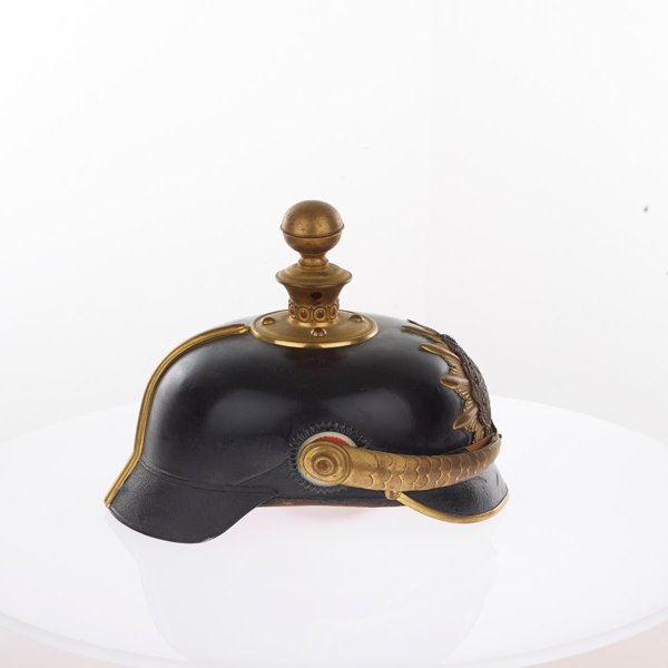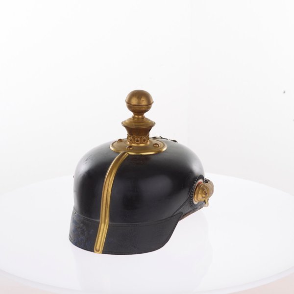 The dragoon helmet was introduced with a brigade order from 24th February 1848. They received nickel silver shiny helmets with a yellow trim, which incorporated the Mecklenburg coat of arms into the badge. The peak made from a small ball symbolised affiliation to the infantry. For parades the helmet was decorated with white horsehair plumes or red for trumpeters.