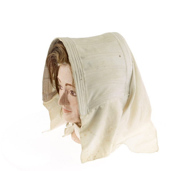 Die Kopfbedeckung ist im 19. Jahrhundert ein wichtiger Teil der Kleidung. Während sich die Männer eine kleine Fischermütze mit Troddel aufsetzen, tragen die knöchellang gewandeten Frauen eine Helgoländer Haube. Der Kopfteil bekommt seine Form durch eingenähte Stäbchen. Daran anschließend fällt der Stoff locker auf die Schultern. Als Sonnen- und Windschutz in einem wird die Haube vor allem zur beliebten Kopfbedeckung bei der Arbeit. Diese Haube ist ein Geschenk von Meta Gau an das Museum.