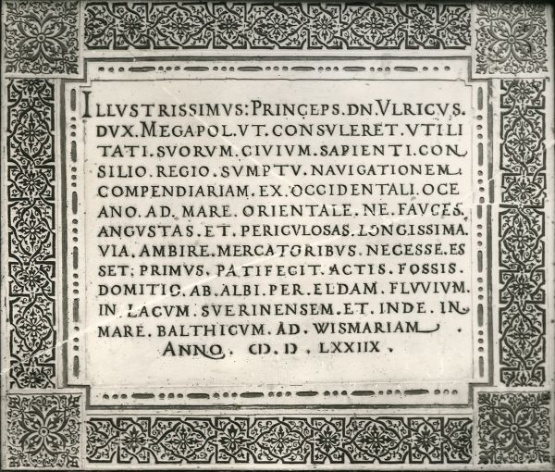 Inschrifttafel Herzog Ulrichs von Mecklenburg auf die Vollendung des Kanals zwischen der Elbe, dem Schweriner See und Wismar