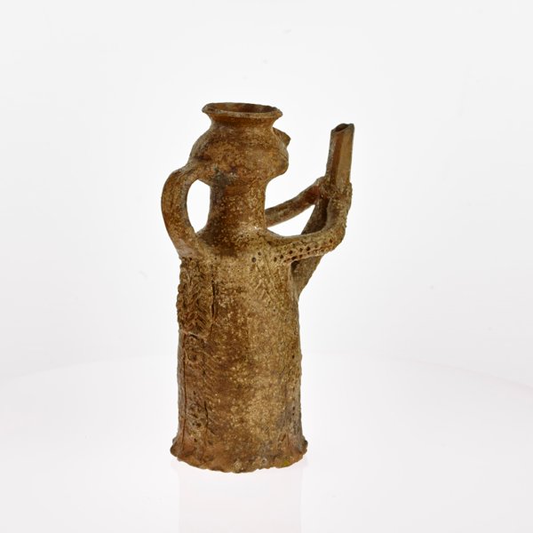 Die Öllampe in anthropomorpher Gestalt ist bemerkenswert reich verziert. Die Lampenfigur hält einen überdimensionalen erigierten Penis (Phallus) als Zeichen männlicher Fruchtbarkeit. In der Tülle befand sich ursprünglich der Leuchtfaden. Die Lampe stammt aus einer Töpferwerkstatt der Neubrandenburger Innenstadt.